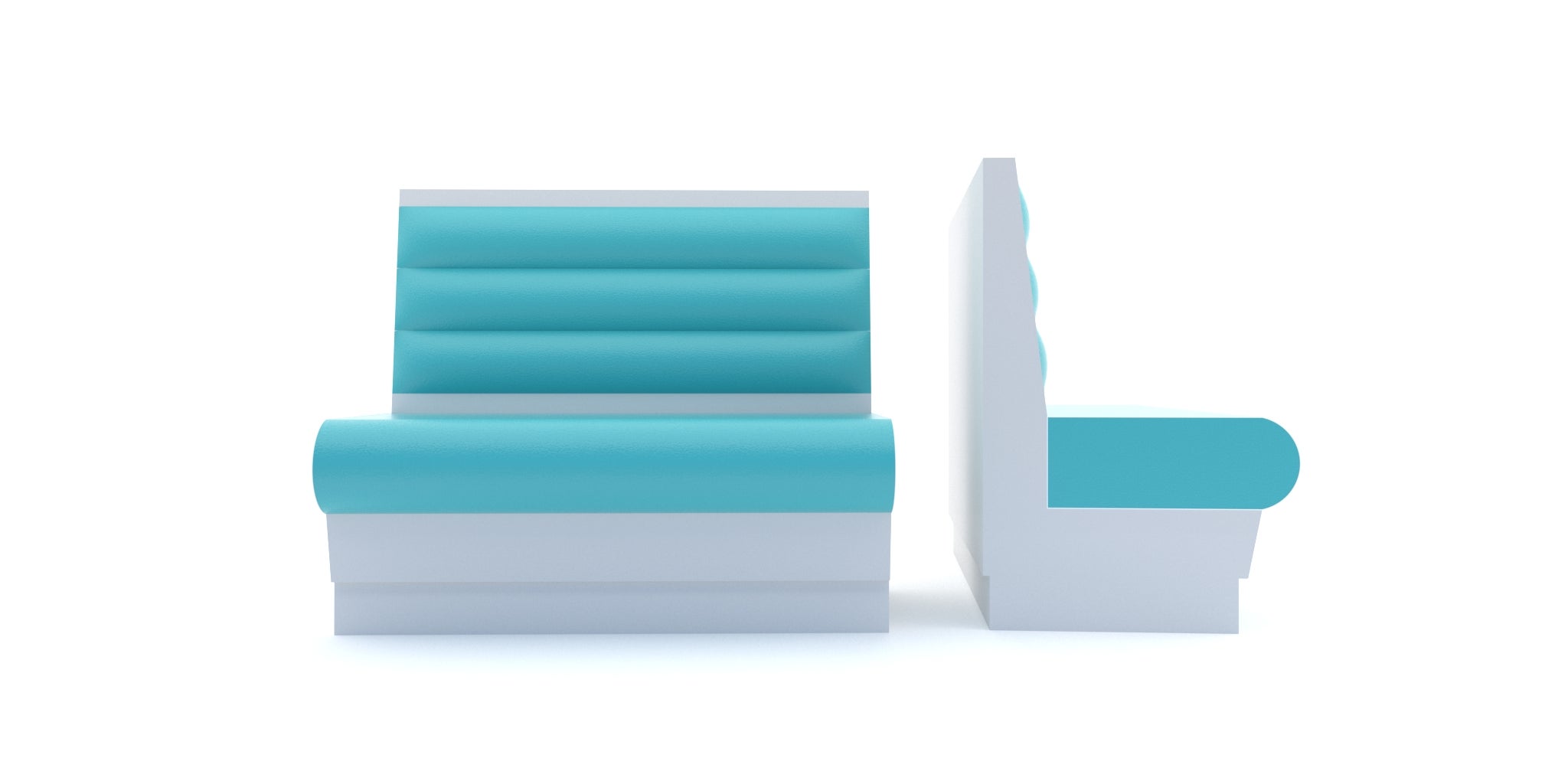 Booth fabricado sob medida. Vendido por metro linear. Pode ser fabricado em modulação simples (apenas um sofá), dupla (dois sofás encaixados um de costas para o outro), curvo, em L (canto 90°) ou ainda modelados no local conforme a necessidade.